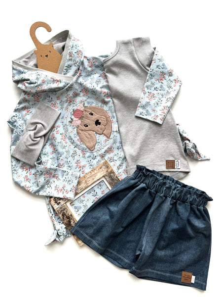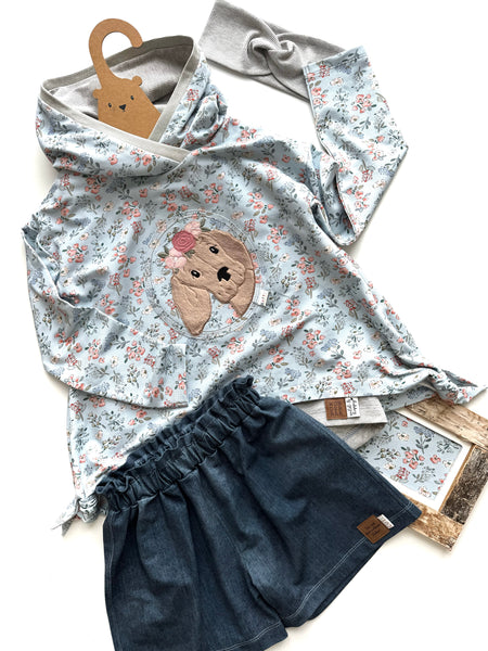 Bezauberndes Set bestehend aus einer lässig fallenden Shorts, einem RibShirt, einem Stirnband  und einem locker fallenden Hoodie mit zauberhafter Stickerei und kleinen Details