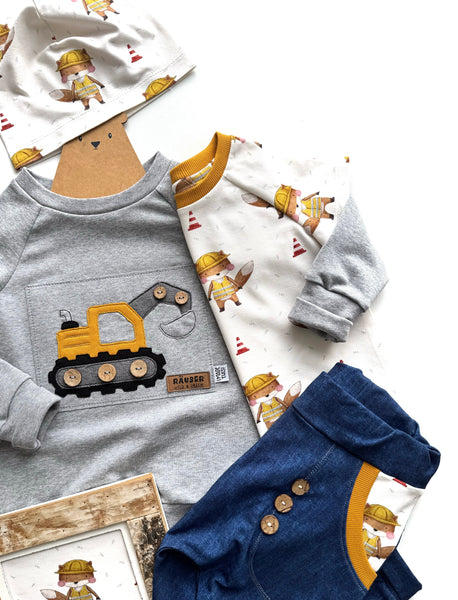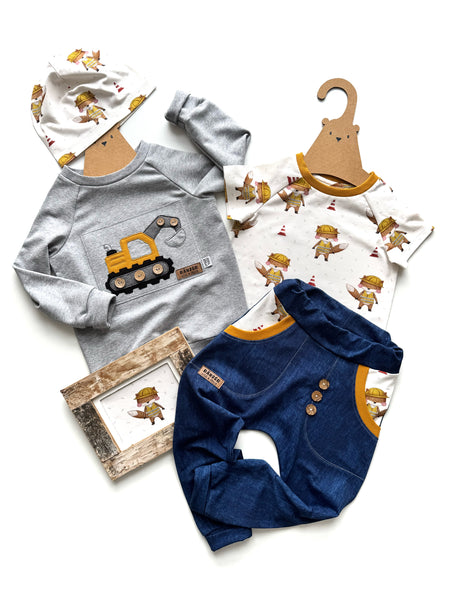 Lässiges Set bestehend aus einer Hose aus weichem Biosweat in Denimoptik, einem Shirt, einer leichten Mütze für die Übergangszeit und einem Sweater mit gesticktem Bagger und kleinen Details